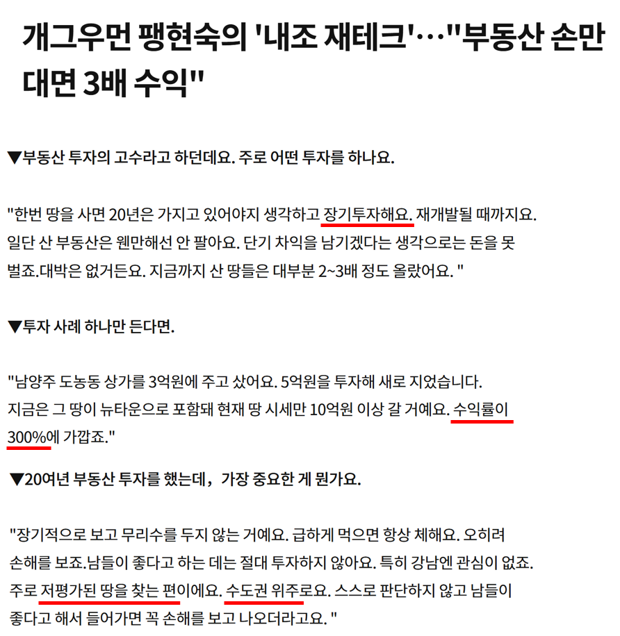 다음은 연예인들 토지 투자 성공사례 기사를 편집한 것이다