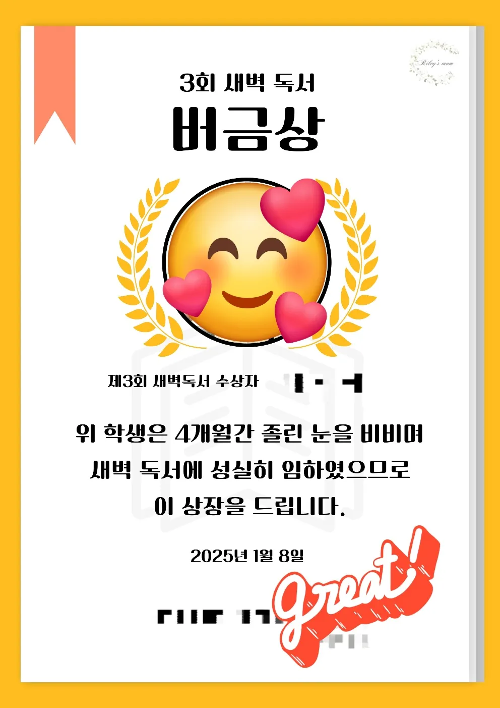 이 새벽독서는 방학기간 동안은 자율적으로 운영되고 있어 앞으로도 매일 참여할 예정이다
