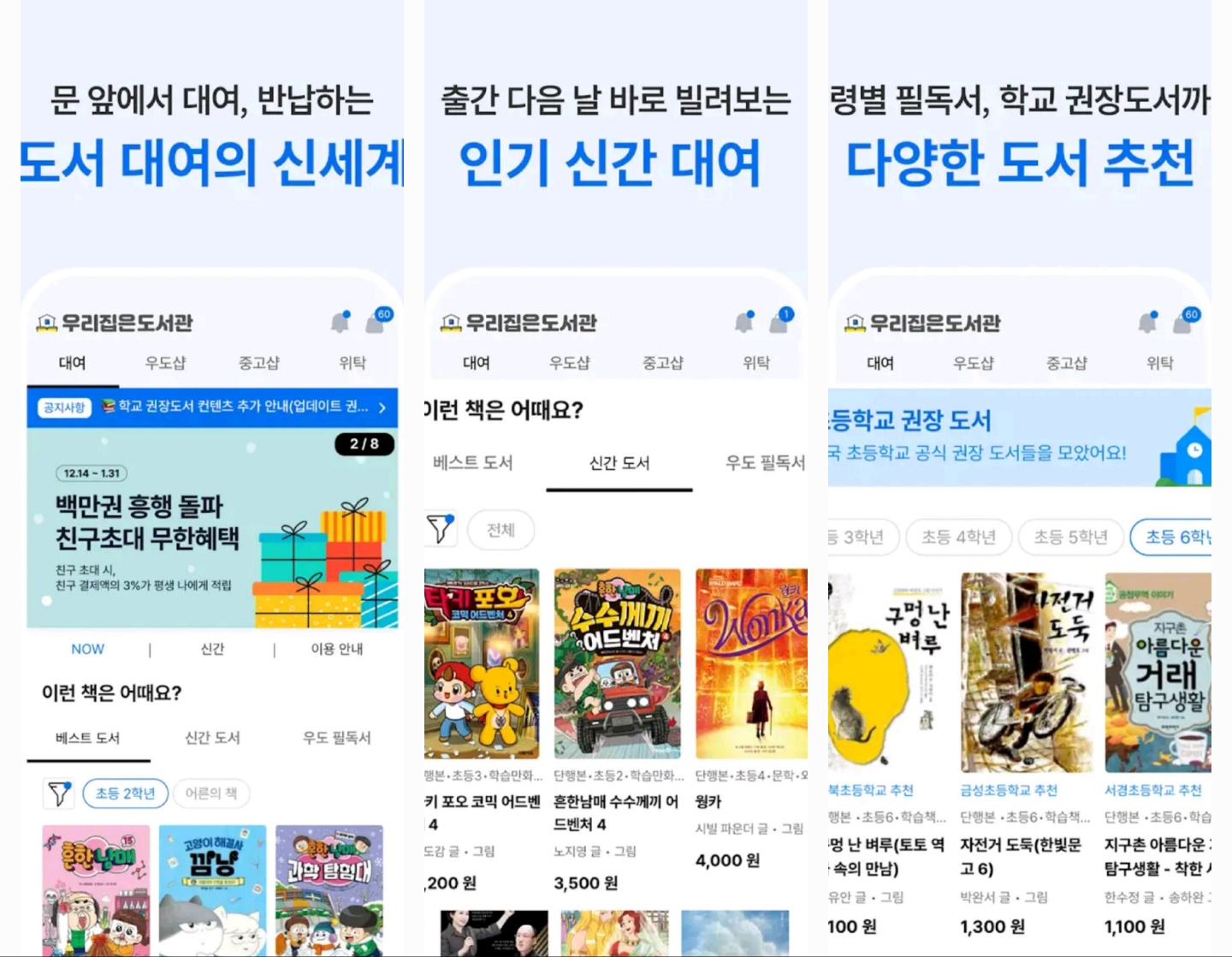 저렴한 책은 500원 정도부터 신간은 3천 원 중반대까지 대여료가 붙는다.